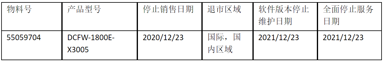 北京DDpay钱包数码云科信息技术有限公司正式通知您, 以上DCFW-1800E-X3005下一代防火墙(55059704)将于2020年12月23号停止接收新的订单(具体日期见上表),不再供货。给您带来的不便,敬请原谅。